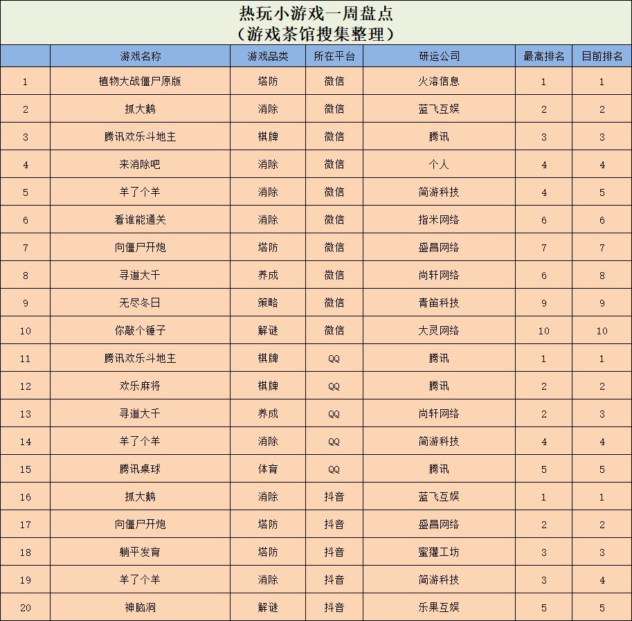 微信小游戏人气榜单TOP3基本保持不变,经典塔防游戏《植物大战僵尸原版》稳坐榜单第1,蓝飞互娱的消除爆款《抓大鹅》和腾讯的棋牌游戏《腾讯欢乐斗地主》则持续分别拿下榜单第2和第3名。同时,多款融合了解谜+消除玩法的产品,在本周冲上了人气榜单前列,包括当前位于微信人气榜第4名的《来消除吧》、第6名的《看谁能通关》和第10名的《你敲个锤子》。