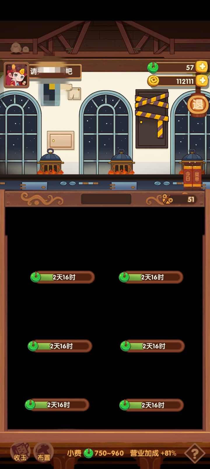 结束营业后,点击了左下的收玉后,在收玉界面试了几个没有获得的桌子后退出到如图界面后就成这样了,并且右上的退出按钮无响应,不能退出了,但是游戏没有卡死,仍能点进收玉和布置界面