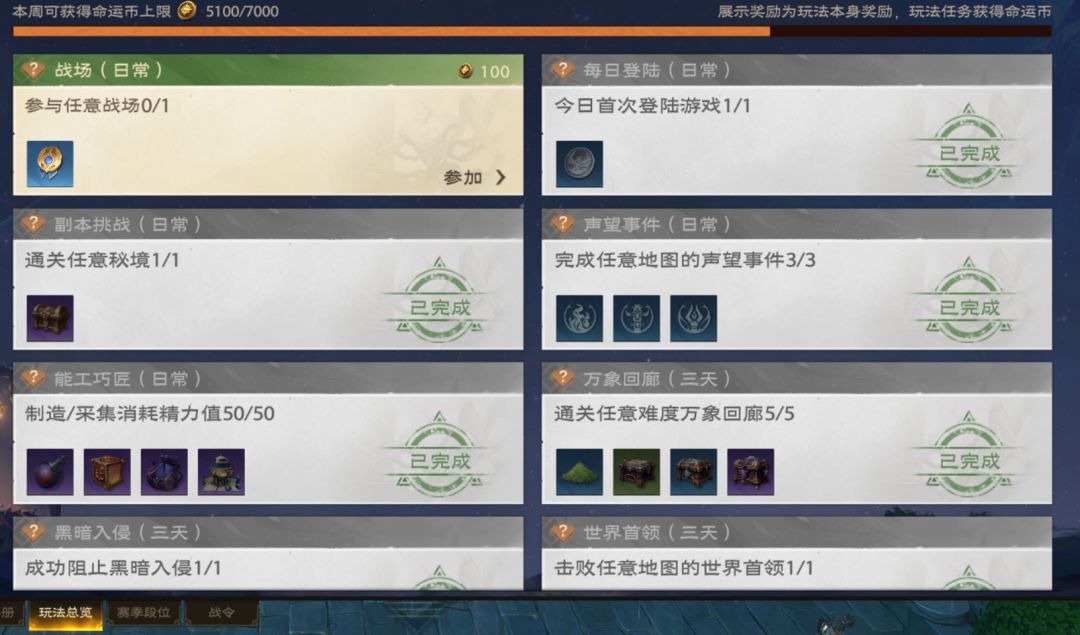 2. 赛季-玩法总览,每天花1小时可以全部做完,推荐必做,获得大量命运币,可以去命运手册商店换很多养成道具