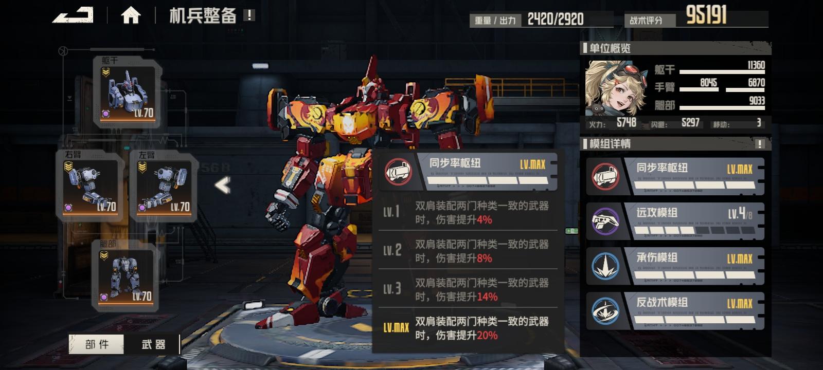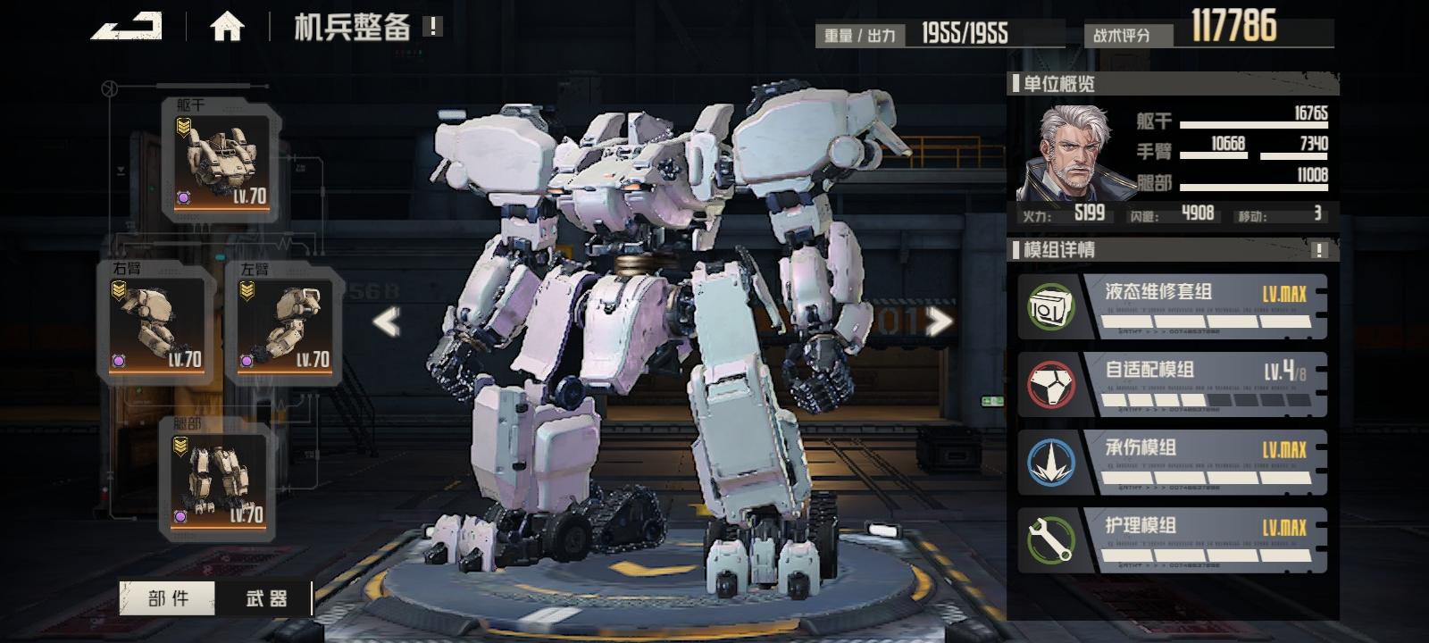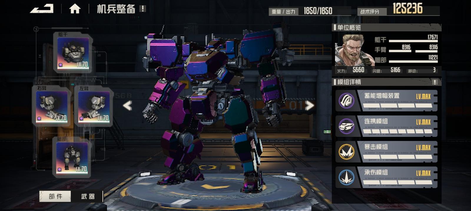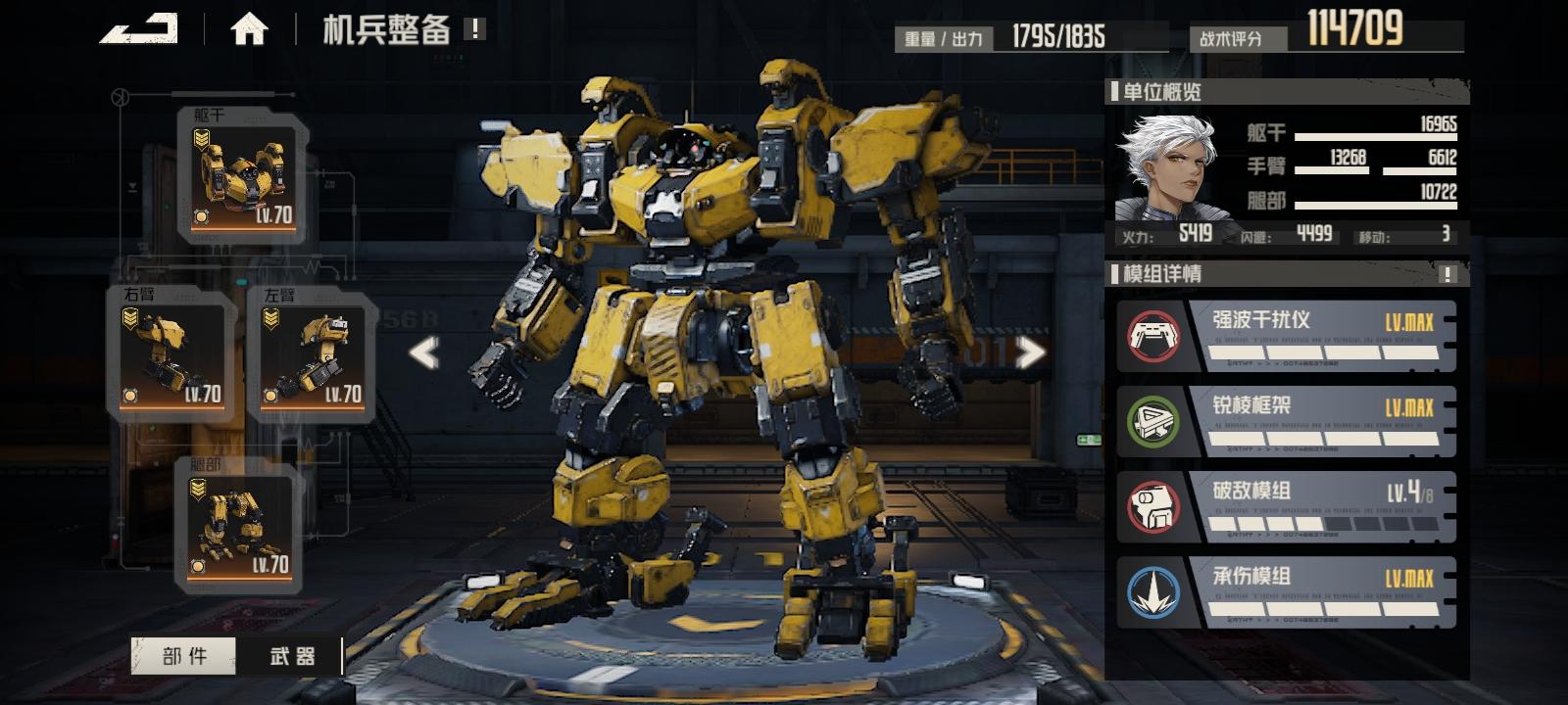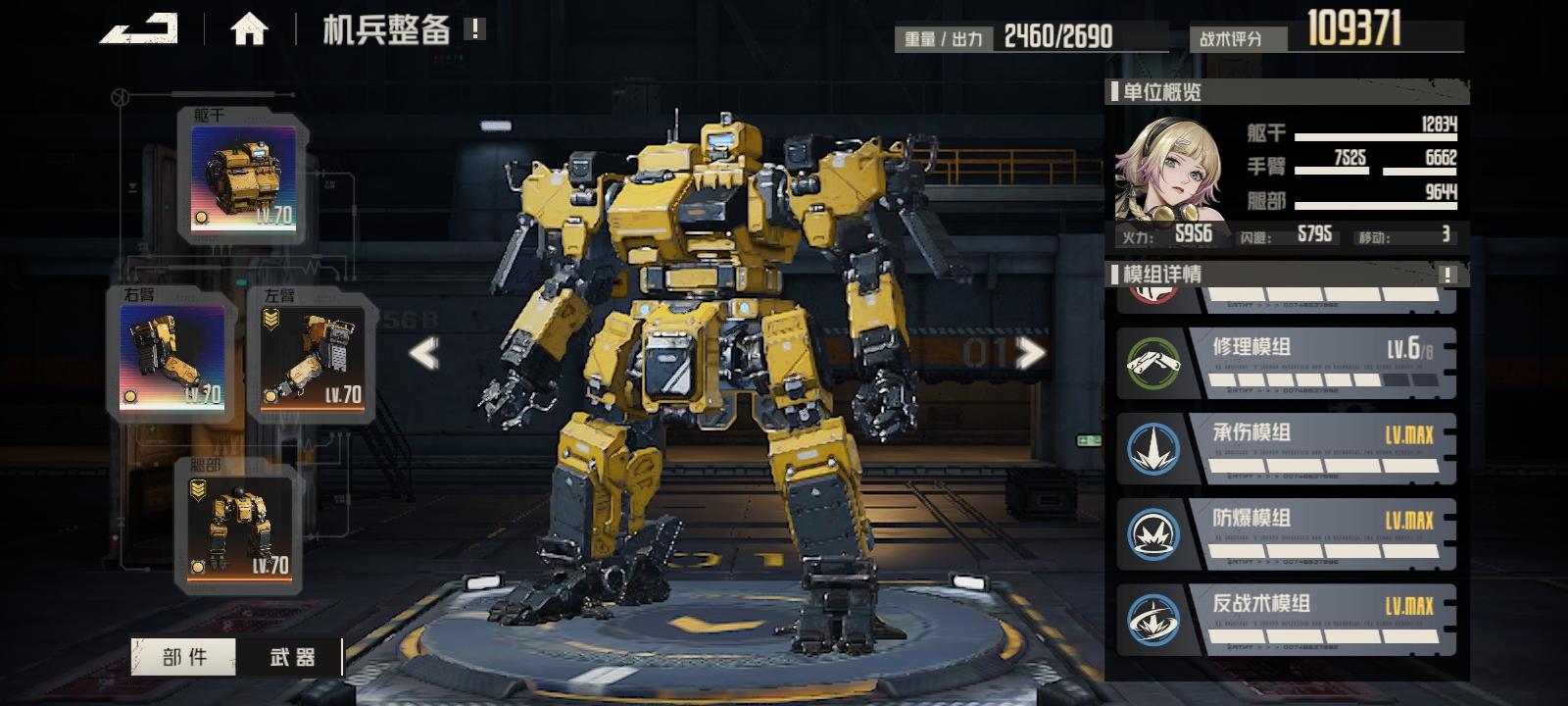 所有成员模组尽量带反战术和承伤模组,重甲尽量带诱导背包,甚至紫蓝色的也行。机甲尽量选品质高并且自带承伤模组的(威廉带蓝机枪和诱导背包,就拦截火箭) ,机甲品质金二胳膊金三胸和腿就够用,这样配置可以插各种金模组(彩不彩甲区别不大,敌人属性严重碾压,最主要的是堆各种减伤)。