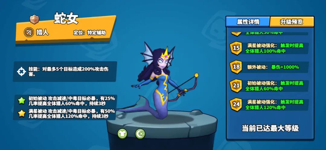 1、解锁蛇女24级天赋:【满星被动强化】触发时提高全体猎人120%命中