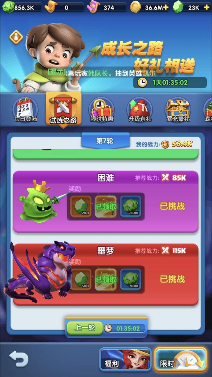 6:前期憋着战力低最多才50k多一点,憋钻石,导致关卡和领地级别低,城墙升不上去,始终解锁不了9英雄卡槽