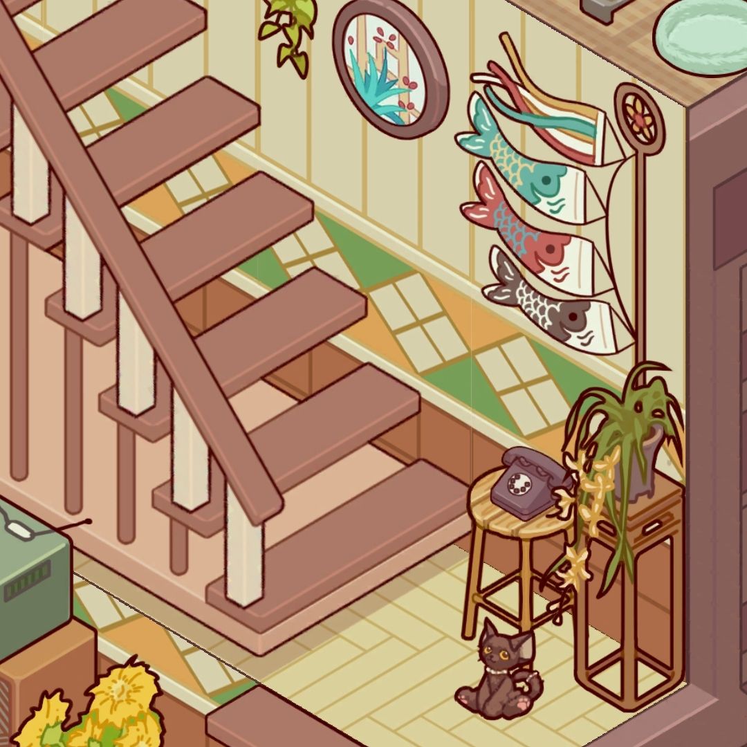 上楼转角放个老式电话,记得挺多动画里,电话都放在楼梯这个位置