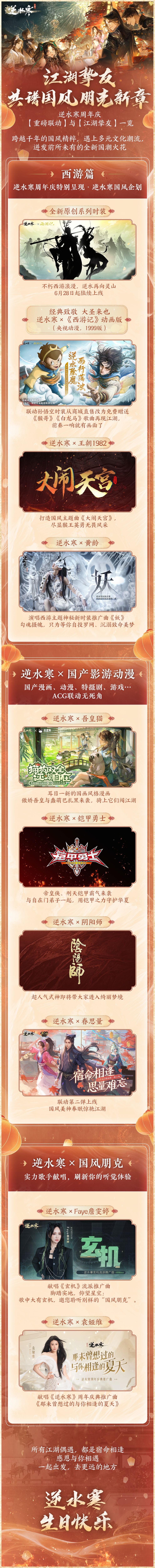 周年庆典将至之时,国风天团2.0也将惊艳来袭,实力歌手袁娅维、Faye詹雯婷、黄龄等大咖都将入驻会呼吸的江湖!联动也异常精彩:中华民族精神图腾之一的经典巨作《西游记》也打破六界束缚来到了逆水寒,开启重磅的【西游篇特别国风企划】;国画风知名IP“吾皇猫”、经典影视《铠甲勇士》、国风动漫《眷思量》联动第二弹、优秀国产游戏《阴阳师》等联动也将震撼来袭……跨越千年的国风精粹,遇上多元的潮流文化,将在逆水寒手游2.0版本迸发前所未有的全新国潮火花!
