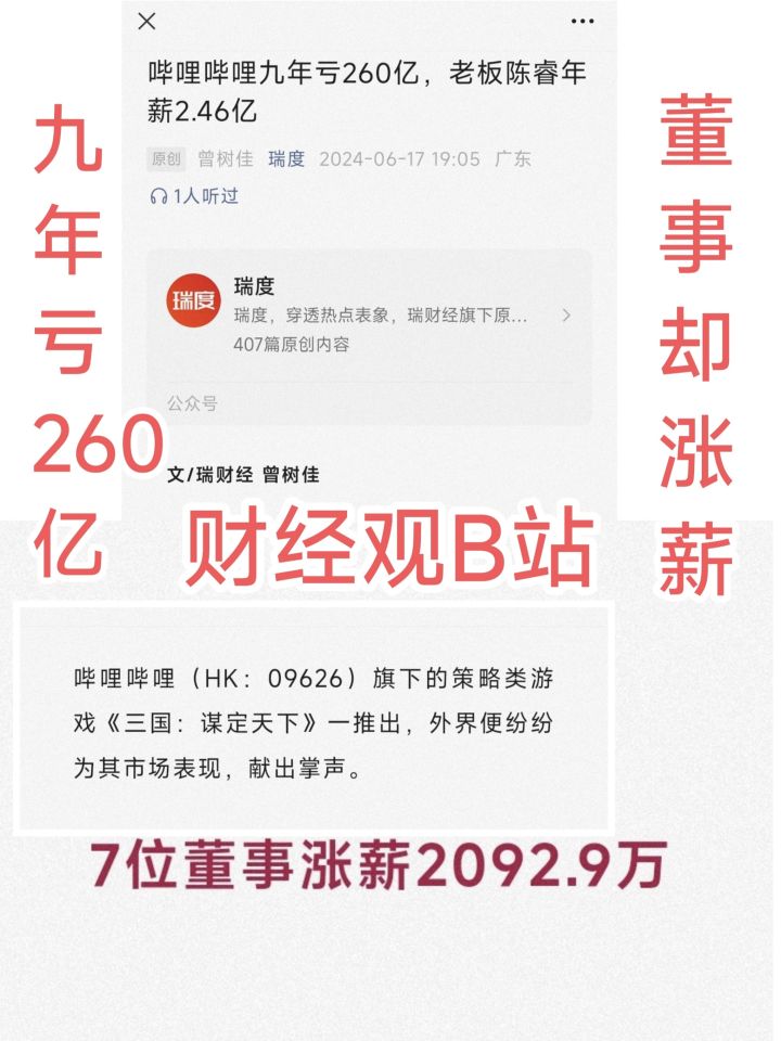 哔哩哔哩九年亏260亿,老板陈睿年薪2.46亿