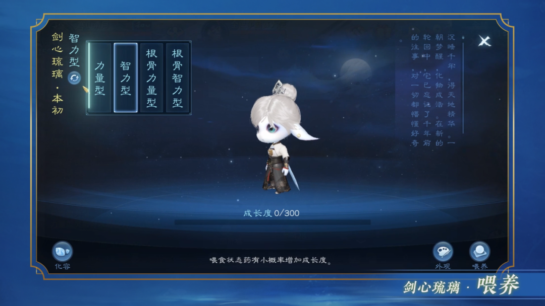 在培养过程当中,小伙伴们还可以将剑心琉璃切换成力量型、智力型、根骨力量型、根骨智力型中任意一款,更便于小伙伴们将剑心琉璃适配在自己所拥有的灵兽上。