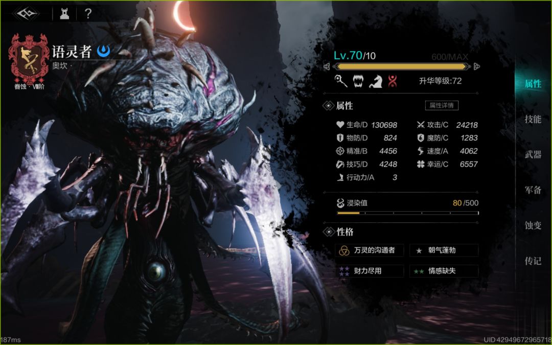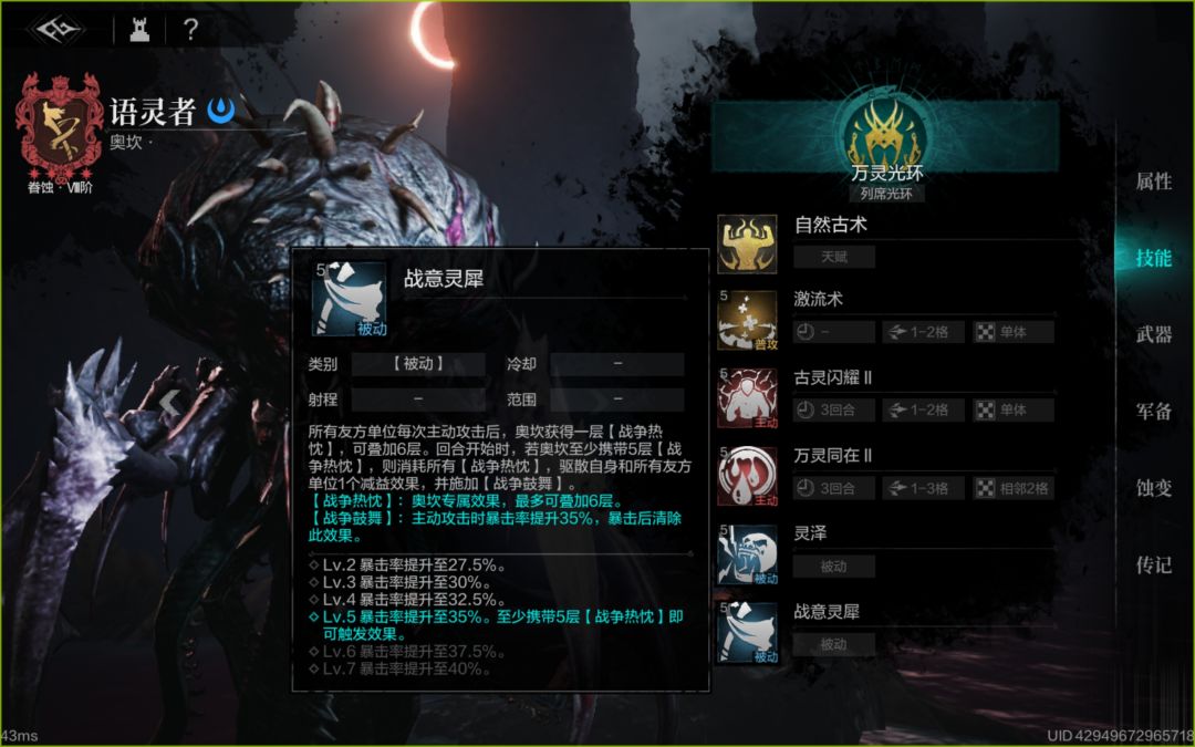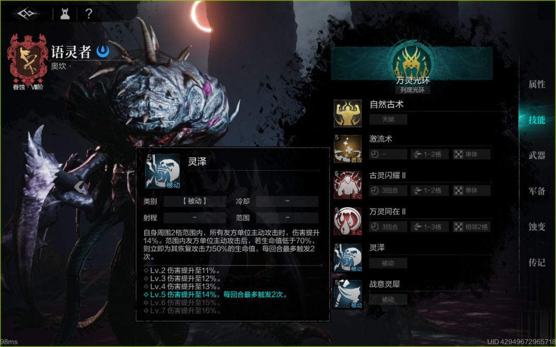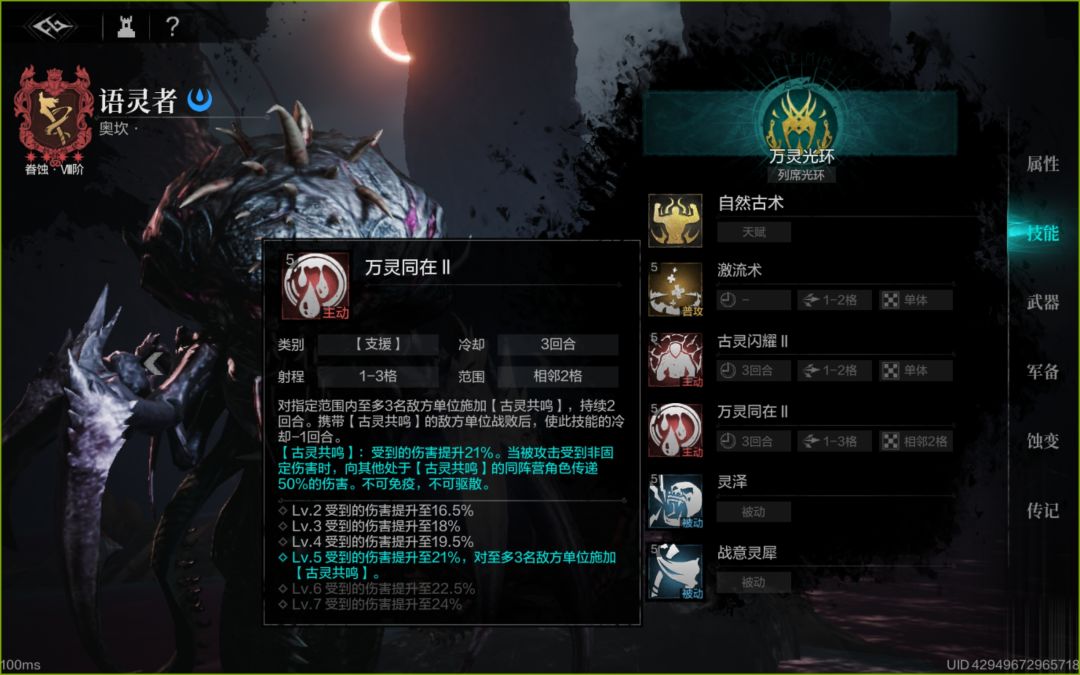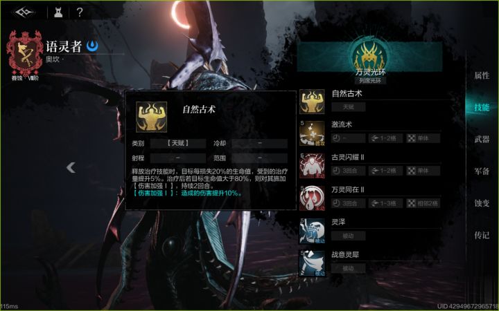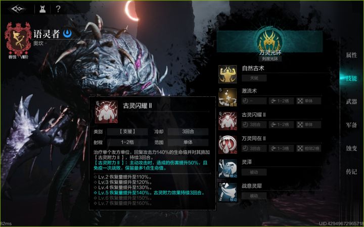 再看天赋“自然古术”,里面也有增伤10%;一技能“古灵闪耀”就更厉害了,增伤50%,更离谱的是给被奶者送一次免死(相当于自带莅临了,还是持续三回合的!)!!!二技能“万灵同在”是最为被玩家诟病的,自动场AI为了给对面挂伤害链子会变相的送人头,但该技能的效果毋庸置疑是好用的,在公主或者火胖之类的群伤输出前来一发,伤害毁天灭地。被动一“灵泽”,增伤14%,范围回血;被动二“战意灵犀”,清负面BUFF,加暴击35%!