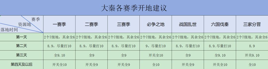 ①第一天:所有剧本都是极限24级,第一天晚上达到24级以后,就可以吃3级增产令,由于3级增产令只加成6级及以下资源地产量,所以第一天全6的产量是要比全7高,如果为了冲势力榜,可以考虑全7。(无论全6还是全7,一定要提前踩好能连接4个4级村的至少2个高级地,方便后续建分城连村庄,以免出现合适距离的高级地被占完的情况)②第二天:必争和三家分晋第二天都可以超过50级,至少也能到45,携带进阶武器后,开9无压力,技能等级起来的情况下打10级地也轻松,但必争出生地有10级地,而三家分晋没有10级地