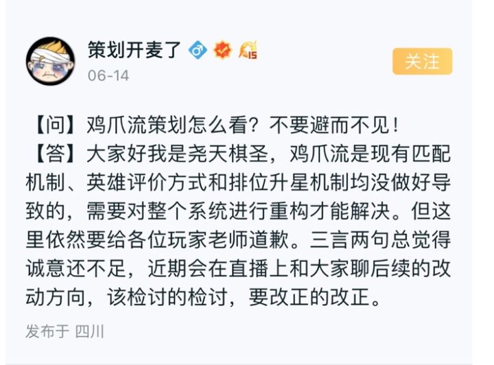 《王者荣耀》策划尧天棋圣前段时间在王者营地“策划开麦了”公开回应“鸡爪流”的问题。策划称“鸡爪流”是现有匹配机制、英雄评价方式和排位升星机制均没做好导致的,需要对整个系统进行重构才能解决。在向玩家们表示歉意后,表示会在近期的直播里和大家谈及后续的改动方向。
