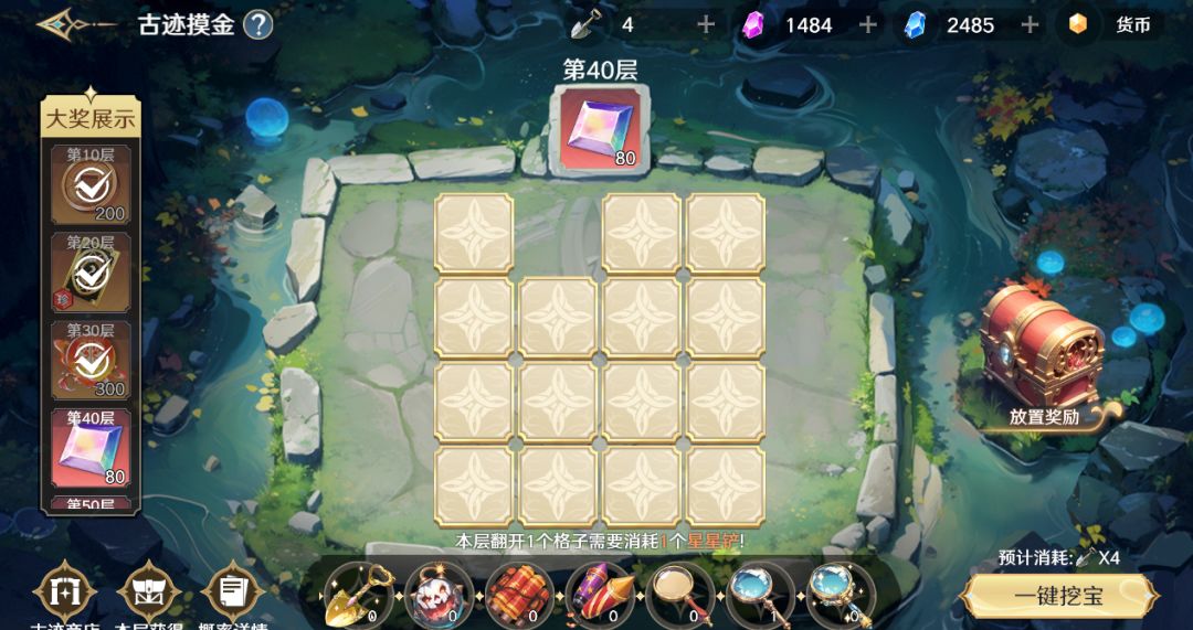 古迹摸金的玩法整体来说十分简单,在每一层都存在着若干个牌子,在牌子下方隐藏着各式各样的奖励,每次到达新一层时,都可以主动选择一个奖励作为本层的最终奖励,使用铲子等道具可以翻开格子并获得格子下的奖励,通往下一层的入口就隐藏在最终奖励的牌子。