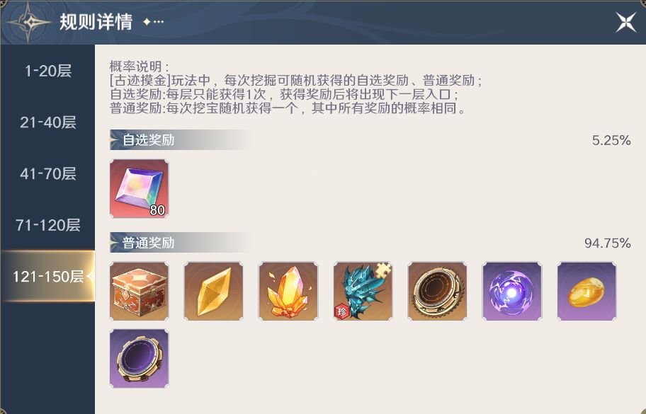 在玩家界面的下方,点击概率详情,可以看到对应层数可获得的基础奖励,每次挖宝都可以随机获得其中的一个。基础奖励的价值会随着层数的增高而变好,在达到121层以上时,基础奖励还能够获得高稀有度的橙珍魂骨碎片自选包。