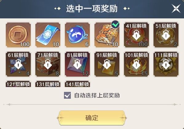 除了逢10的层数外,其余层数都可以自选一个格子的奖励,获得该奖励后即可打开前往下一层的入口。自选奖励的数量需要达到对应层数来解锁,可以根据自身的需要来进行选择,比较推荐珍藏卡册、随机印记、生命菁华。