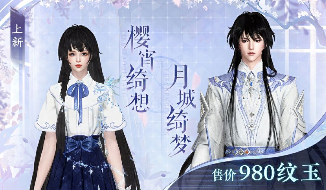 全新时装【月城绮梦】、【樱宵绮想】如同一篇浪漫童话,极尽梦幻与优雅。素白色的衣袍仿佛从天边皎皎无尘的明月处取色,纯净素雅。墨蓝色的花纹交织其上,增添来自夜色与星河的神秘。