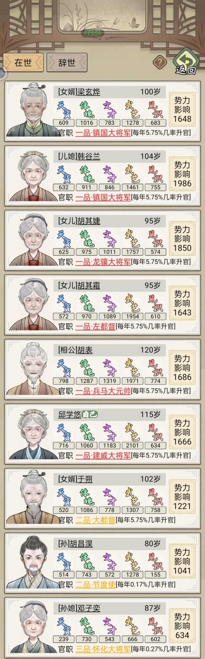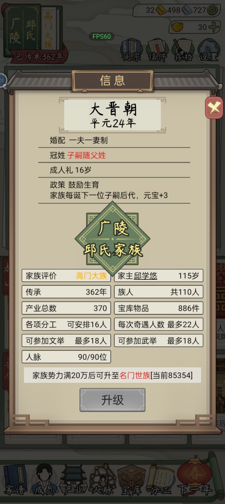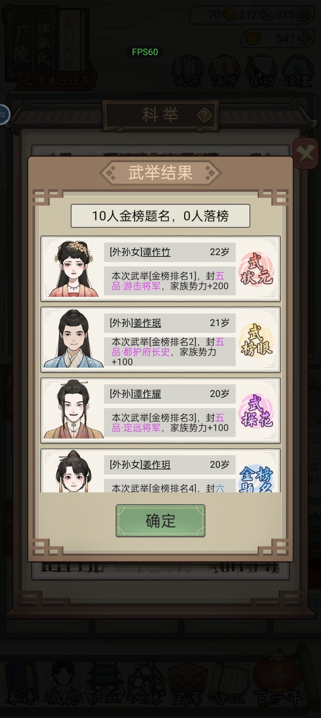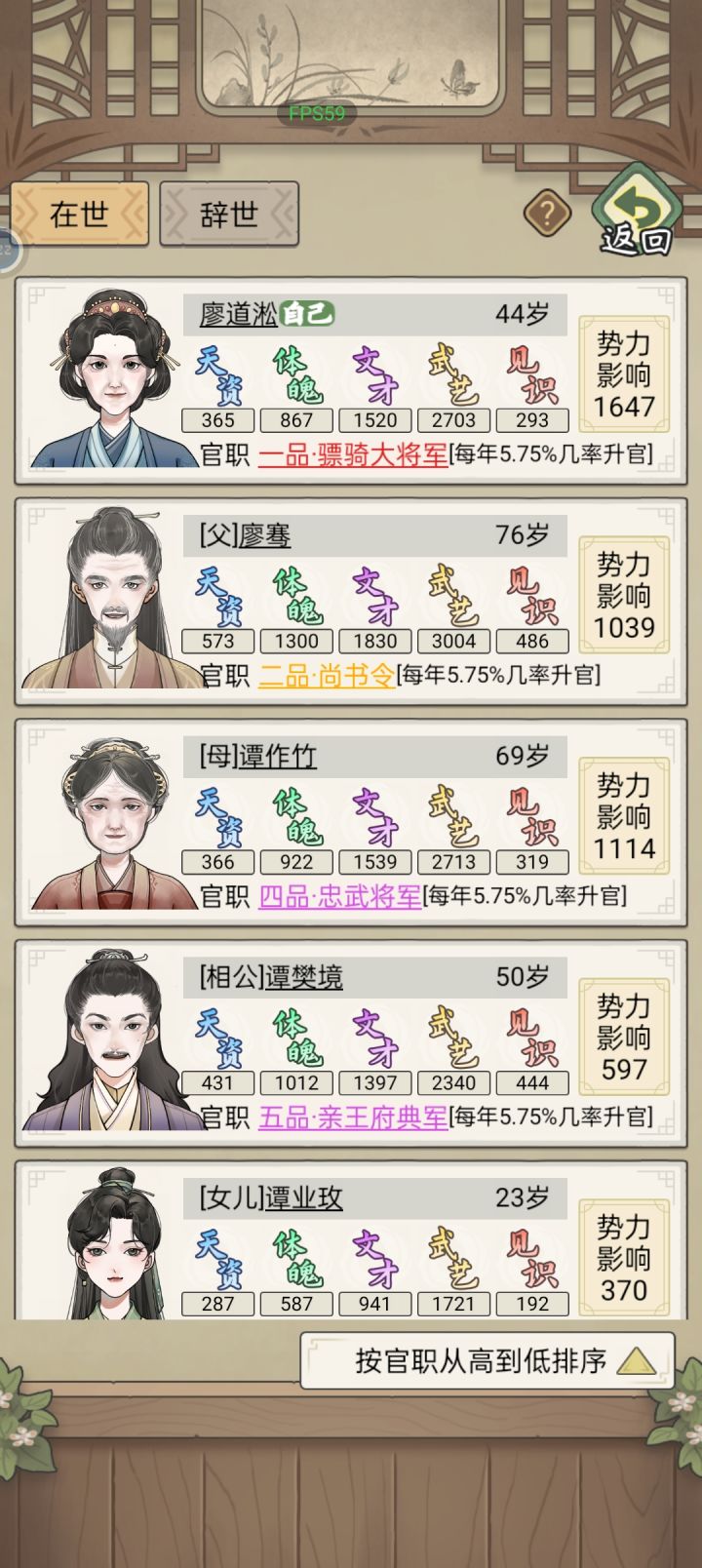 5、分工:可增加属性、获得藏宝,默认按属性高低分工,需要花钱。入不敷出时建议分工只选文武艺和体魄。族人获封一品大官后只培养体魄活得更久,手动将其它分工给别人,避免浪费。