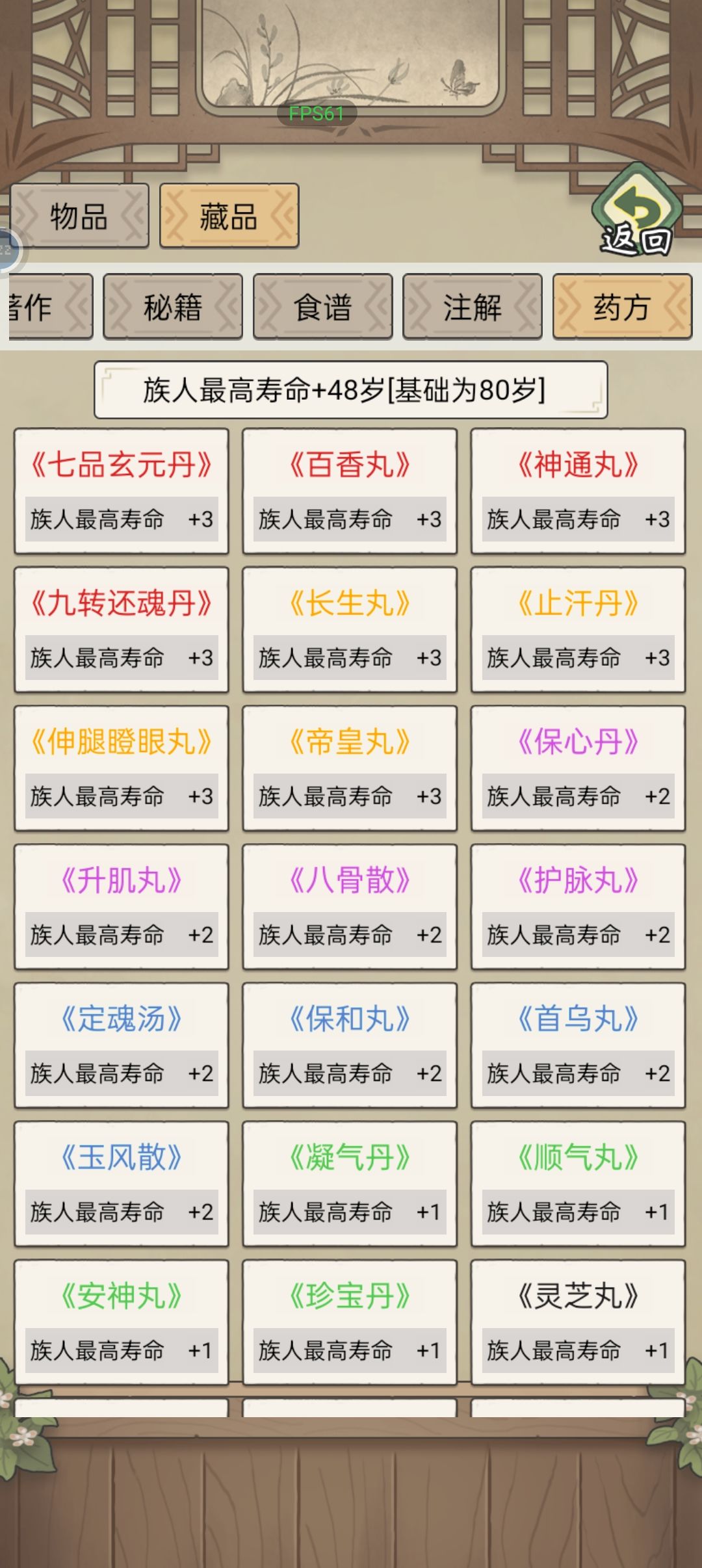 4、宝库:赶山、赶海、分工获得宝贝和藏品,注意自动分配只分配新入库藏宝。宝贝可直接增加武艺、天资、见识、体魄。藏品有几率增加文才、武艺、体魄、升官几率和最大寿命,集满后可以活到128岁且正常升官,比正常多48年发展时间!继承人生时一定要选继承宝库,因为藏品积攒不易,继承人生被分割后几乎很难再获得(此处bug?)