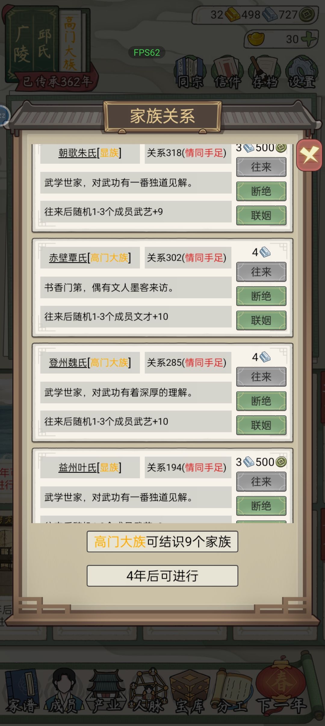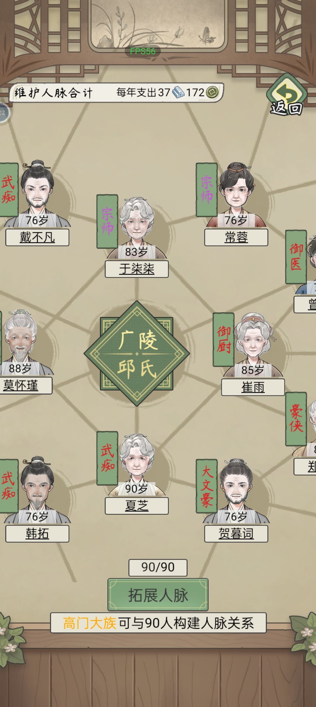 3、人脉:红色必秒,其它前期只选择40铜以下蓝色,后期人脉选满,人脉寿尽时免费更换优先级武艺>文才>体魄>天资>见识且年龄小优先,后期不缺钱了直接人脉铺满,慢慢替换成全红,这路362年了人脉还只有一半是红色,捷径是看广告得免费红色人脉,可快速积攒人脉、培养家族优质人才,提升势力。继承人生后人口少时爽飞,一年成状元不是梦。