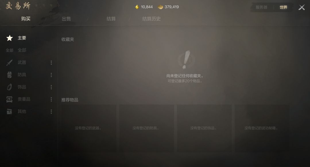 交易所分为副武器和世界两个部分,可以查看世界里道具价格进行比较。