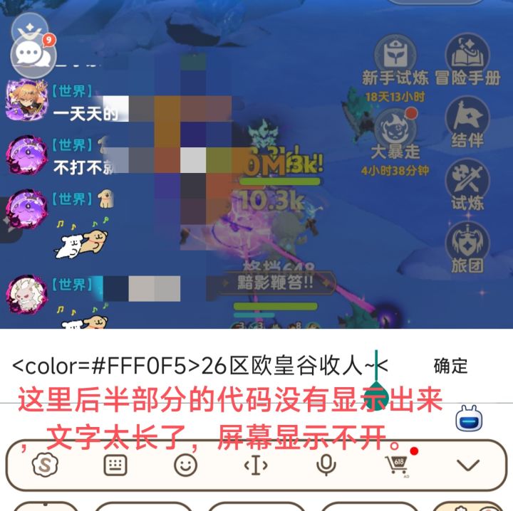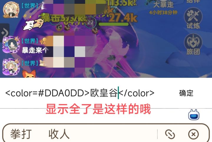 注意:①注意颜色代码和英文单词的表述不同,颜色代码是<color=#DDA0DD>,英文单词是<color=red>,注意等号后部分!!单词前没有井号,②部分颜色代码/颜色英语游戏内不识别,③要说的话太长了会发不出去,代码也是占字符的,只是发出去被隐藏了,最多27字符,④各个频道都可以发,世界/旅团/私聊/各种副本,⑤敏感字不能打还是会和谐。