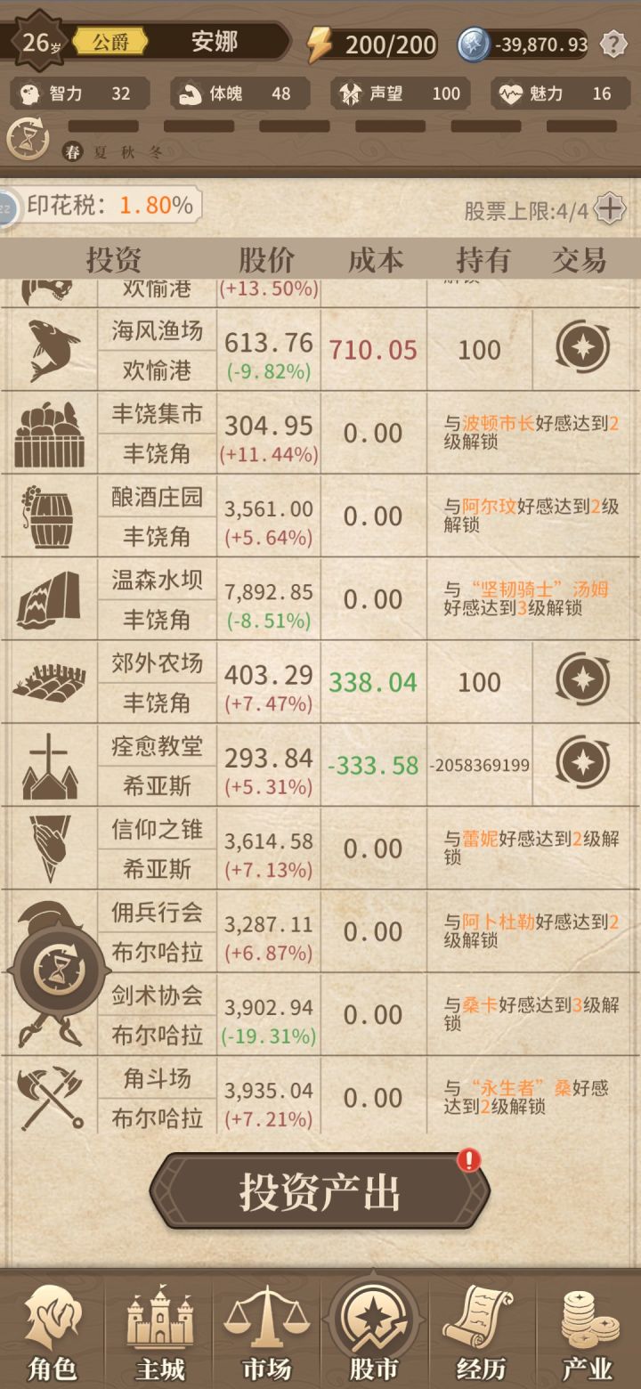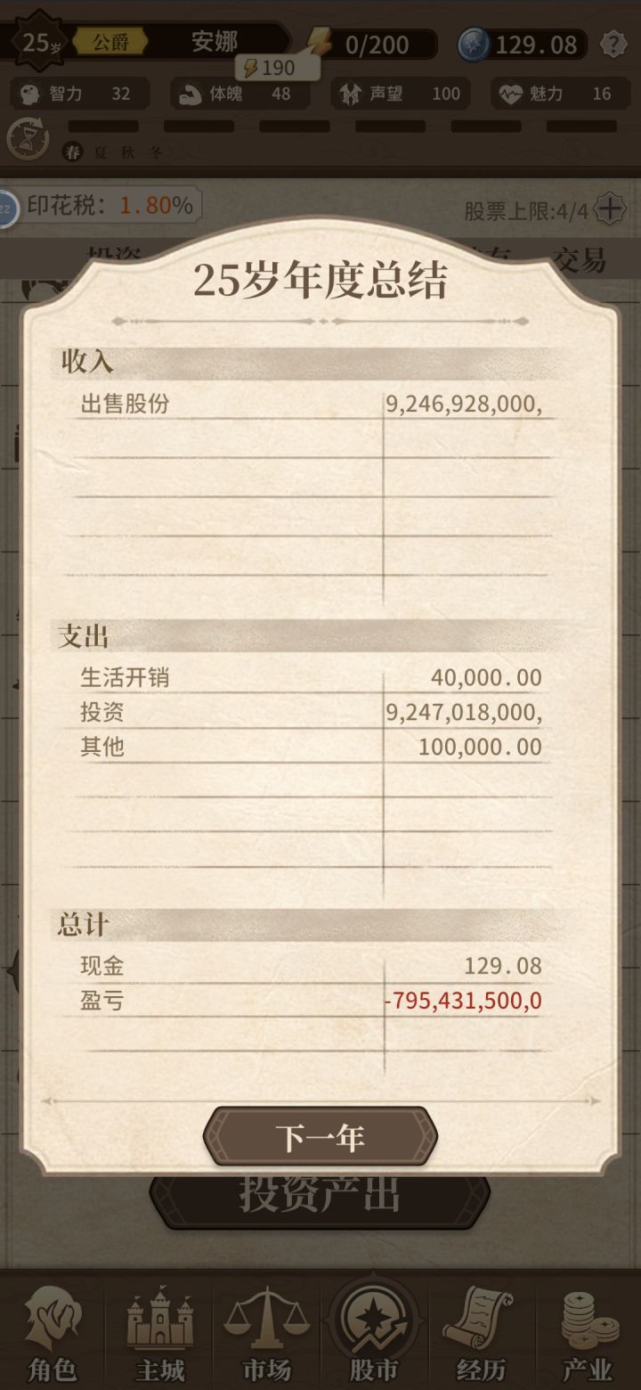 今天玩游戏时突然发现这游戏有bug,股票买卖,只要你不把股票全卖出去,你可以在一个时间段里不停地进行股票买卖。丧心病狂,年赚(亏)百亿攻略
