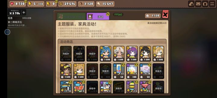 花费29600宝石拿下活动池皮肤4个,获得3120木材,19647布匹,剩余1130星星,拿下包括二公主以及全部宠物对应系列皮肤(如果宝石实在是不想存那么久,没强迫症的,就先不弄宠物和二公主皮肤,毕竟光四个宠物和二公主皮肤就要8000布匹了,如果只是为了获得背景,英雄皮肤,家具,可以不着急换取宠物和二公主的皮肤,制作完11个皮肤和一些家具就可以解锁背景了,不需要全部拥有,这样可以少花宝石的情况下也可以先享受背景和皮肤)。