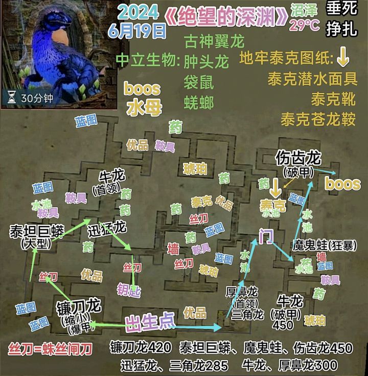 6:伤齿龙(破甲): 极高难度,盾牌格挡蹲墙角拿剑清理,吃操作,单机可退出重进消除破甲buff,及时使用兴奋剂。