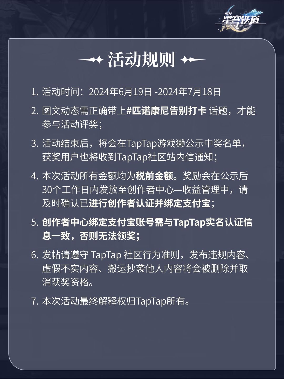 即日起,带话题 #匹诺康尼告别打卡 发布游戏相关的图文动态,即可成功参与活动,抽648元、68元、随机角色立牌、宇宙糖果屋系列色纸!奖品详情看图⬆️