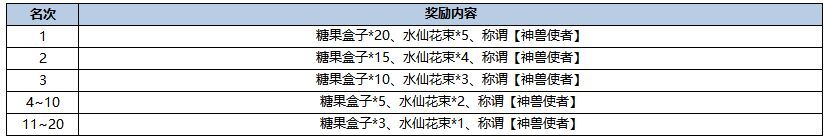 活动描述:活动结算时,最快兑换出神兽的20名玩家可以获得丰厚奖励哦~奖励配置: