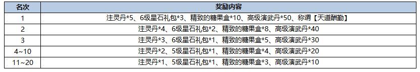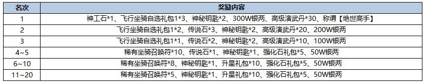 活动描述:活动结算时,战力最高的20名玩家可以获取丰厚奖励哦~奖励配置: