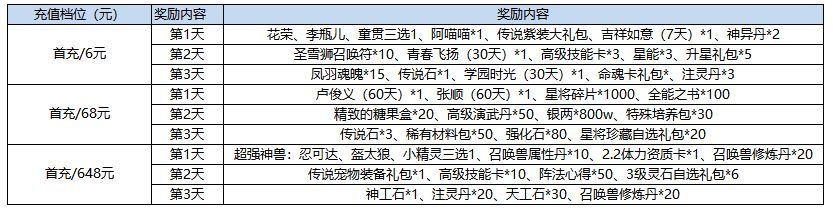 活动五:首充礼包活动内容:水粉们首次充值任意金额即可领取价值丰厚的首充礼包。
