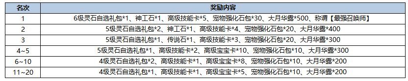 活动描述:活动结算时,召唤兽战力最高的20名玩家可以获取丰厚奖励哦~奖励配置: