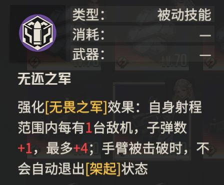 双手武器一大弱点就是一边手臂被破坏后,虽然能够继续使用武器攻击,但是命中率会大幅下降,导致输出能力大打折扣,有了此技能的加持,便能够缓解这种问题,在断手后,依旧能够提供一定输出,在维修条件有限时,可以将有限的维修机会给予其他友军。突击手输出中协力攻击占据不小的份额,此技能能够使得断手后依旧能够提供稳定的协力攻击