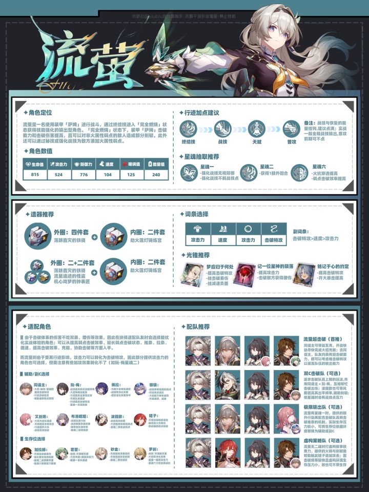 常规战技释放时,消耗生命值为流萤提供充能以加速大招启动;而强化战技释放时可以为敌方挂上火属性弱点,辅助流萤削韧以尽早打出击破伤害;天赋提供一定的减伤、效果抵抗、解负面以保证其生存能力,提供的回能可帮助流萤首动开大;而三种额外行迹则分别提供了无视弱点削韧、攻击力转击破特攻、获得额外超击破能力等效果;