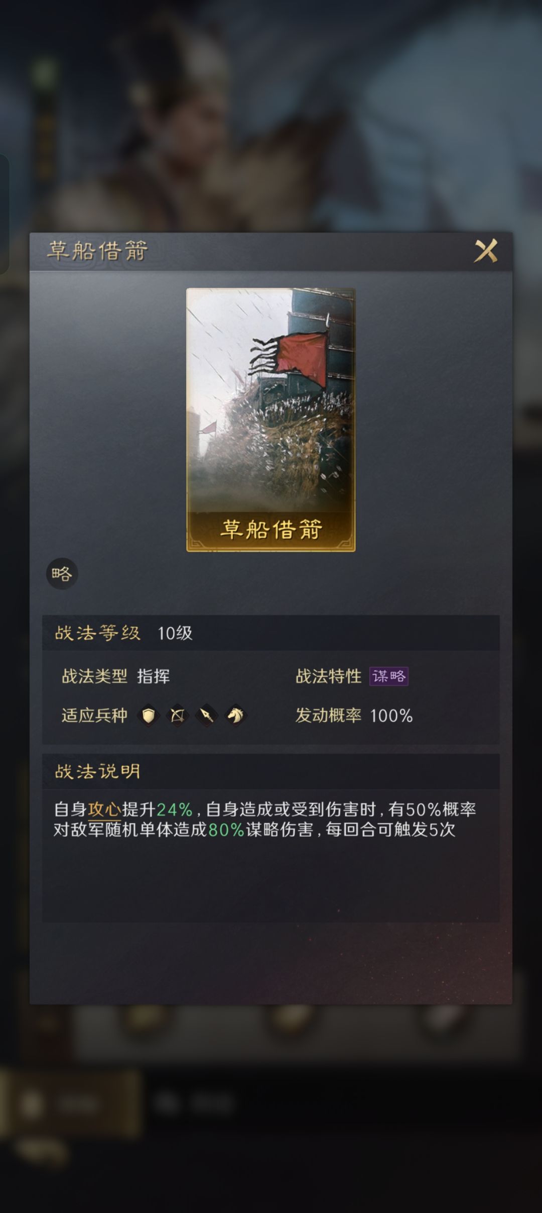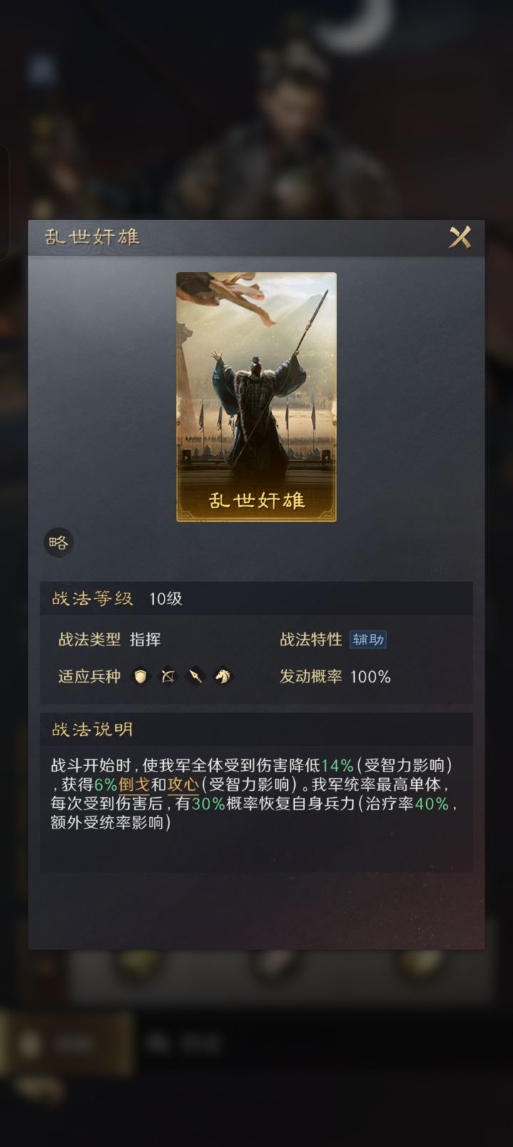 所以诸葛亮虽然站在第一排但是,不要带任何防御战法,直接输出拉满即可,这里推荐(料事如神,出其不意。哈,有控制,有点杀)。