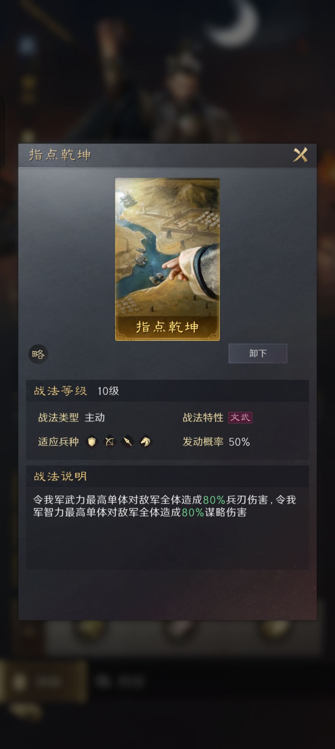 曹操第二个技能我是带了指点乾坤的,非常符合曹操的气质,也非常对得起这个技能输出拉满,不能再比这个情况输出高了,(诸葛和吕布分别是智力和武力最高的武将)。