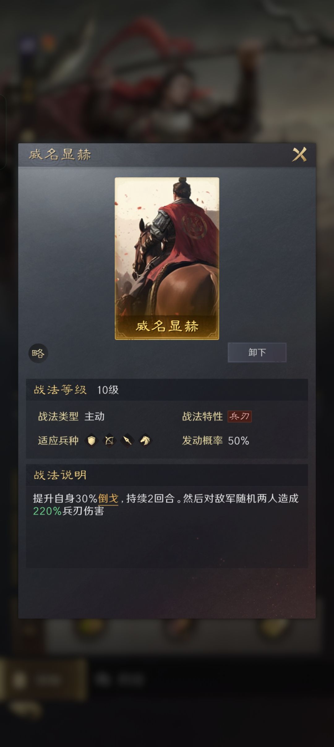 然后是主力输出,吕布,吕布我个人不推荐走前排玩法,不算太好受,因为如果你抽到了辕门射戟,那么还是吕布自己带最好,而且这里由于不是方圆阵,那么吕布第二个技能还是带主动的好,这样可以把收益吃满,推荐威名显赫。这套阵容没有奶,所以吸血挺重要的,加上曹操技能有百分之36吸血。而且辕门射戟可以增加几率,几乎全程吸。