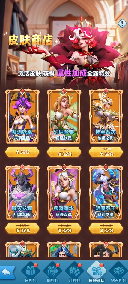 商店位于主城 / 野外【礼包】功能中,旅行者们可前往选购心仪的英雄皮肤