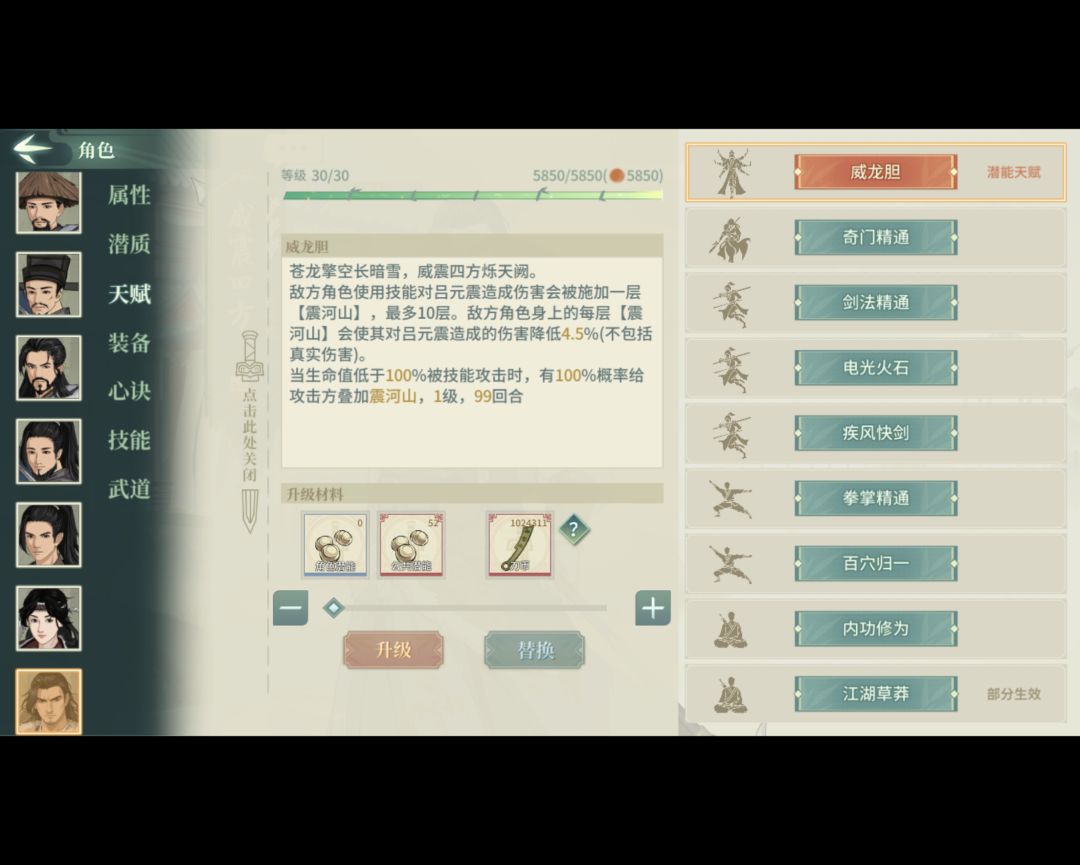 威龙胆-吕元震的潜能有点类似檀道济,给自身叠加伤害减免,该减免是作用于敌方给到自己的除真伤外的技能伤害;30级后每层可减免4.5%伤害,最高10层,共45%。数值非常可观,男友力拉满。