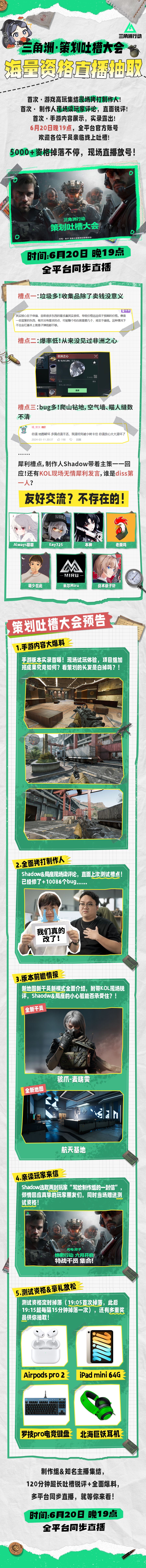 就在今晚!6月20日19点《三角洲行动》策划吐槽大会将开启全平台直播!