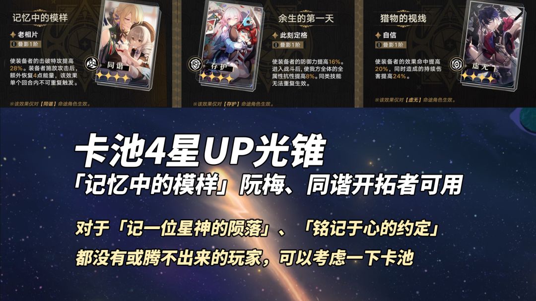 不过光锥期望的一回事,实际还得考虑各自情况。例如部分开拓者未持有上面提及2种光锥(黑塔债券全拿去换通票或其他光锥),又或是上述光锥已有其他角色使用腾不开手。此时就得考虑一下是否要抽取「梦应归于何处」,毕竟其余4星可找不出差距那么小的了。恰好同期4星UP「记忆中的模样」,可给流萤配队中的同谐开拓者、阮梅使用。