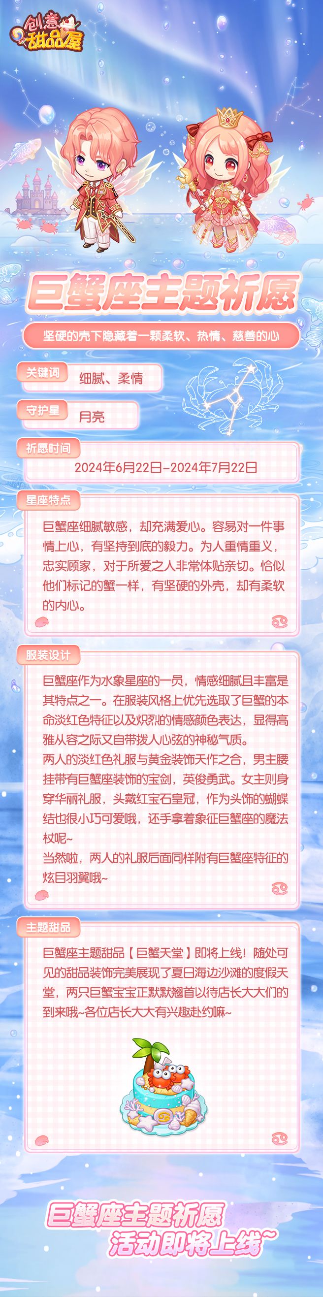 《创意甜品屋》巨蟹座的主题服装和主题甜品即将上线啦,一起康康新情报吧!