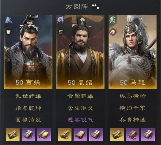 因马超自带战法会给自身提供大量的会心效果,袁绍的战法可让马超打出更高伤害。马超身板较脆,需要队友提供减伤和为他附加倒戈状态(武力伤害吸血),曹操的自带战法乱世奸雄正好可提供这两个效果,另外曹操携带了蓄势待发为马超提供增伤。袁绍携带了舍生取义保马超前两回合可打出追击伤害。