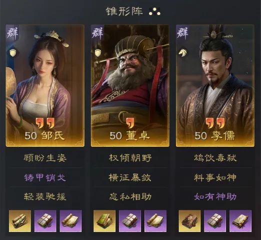 邹氏自带战法对于全队有一定的减伤效果,但是邹氏受到伤害会降低此效果量,所以邹氏在抵御次数较频繁的队伍中为佳。推荐配队武将徐盛、蔡文姬等,或通过自身携带铸甲销戈,轻装驰援等战法解决。