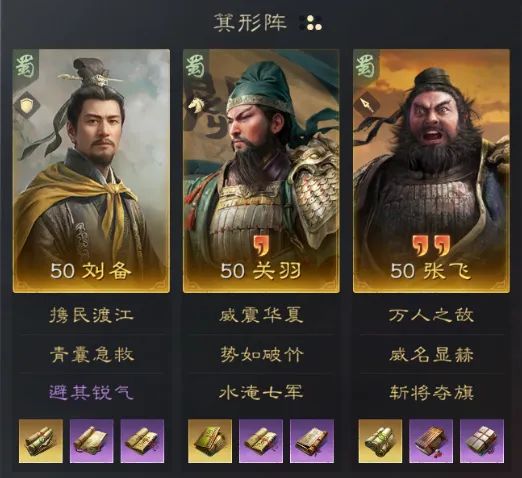 刘备自带战法携民渡江和青囊急救为队伍提供治疗、统率提升和驱散负面状态等效果,避其锐气则可增加刘备作为前排的坦度。张飞先手打出万人之敌造成震慑效果后,关羽势如破竹增加暴击率,配合威震华夏和水淹七军打出爆炸伤害。