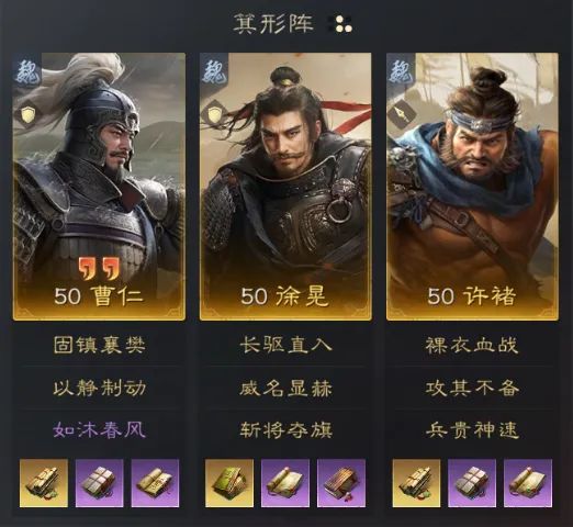 为自身有减伤的前排补一定的减伤。奇数回合防追击和兵刃,偶数回合防谋略和主动。换句话说敌方如果谋略主动型战法在奇数回合放,或敌方武力追击战法在偶数回合放,这个战法就无法发挥出效果。适配武将为曹仁。