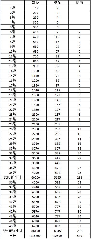 根据这个表我们可以的出来1-35和36-45之间需要的材料差不多,也就是需要用的时间也是差不多的,按过去的话大概需要1年的时间,不过在新加入了每日任务的材料和考虑一些其他活动,大致需要九个月左右就能从35升至45