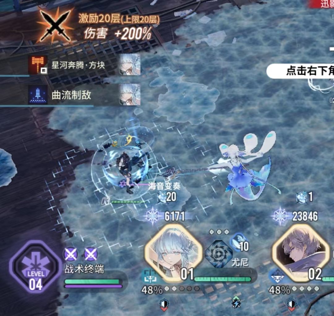 这期的BOSS简直就是为尤尼设计的,尤尼二技能水地板可以限制二阶段BOSS混沌的耀浪的发挥。BOSS脚下没有水地板,就会加攻击、加基础减伤,根本打不动。