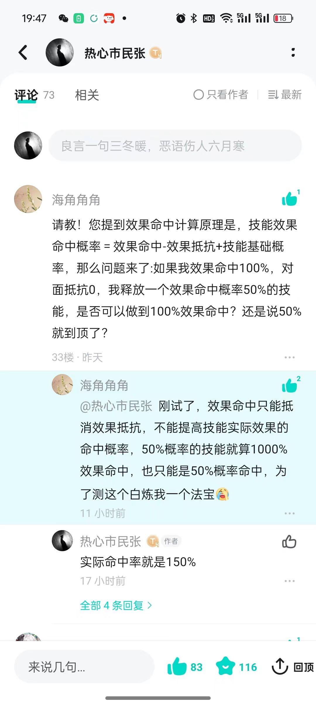之前准备了两周论道,写了一篇PVP攻略,本来就已经准备退坑了,直到看到这样的评论,说写的效果命中公式不对。