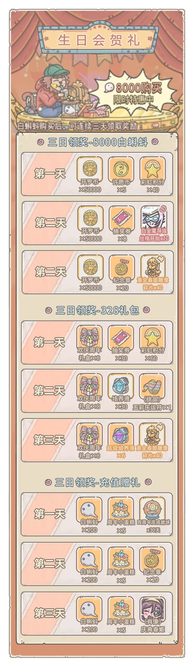 1、活动期间,可购买白蝌蚪生日会贺礼,连续3天领取奖励