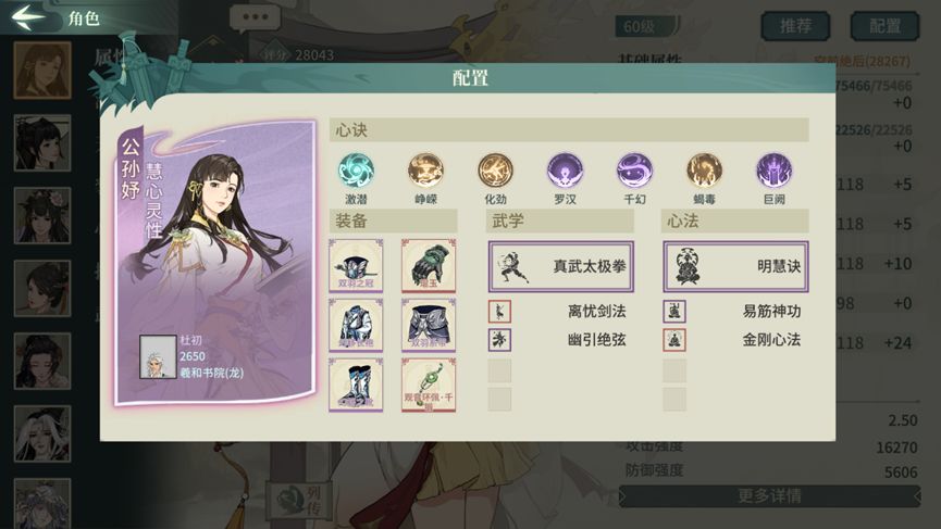 配置细节:峥嵘、千幻、观音配、双羽头提供69悟性,使天赋刷buff概率达到最大(66悟性40概率);易经、金刚、双羽、化劲达到满减;蝎毒、巨阙提供负面穿透与控制效果;武器用昆玉和拏云都可行