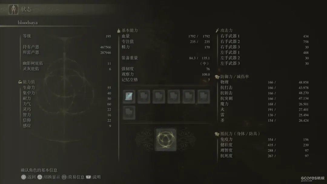 装备方面可以用「拉塔恩狮子」一套,后面能换DLC新的头部「铜绿头盔」或者「神兽头部」。护符用「大壶众武护符」、「黄金树的恩惠」、「龙徽大盾护符」和DLC的新护符「干枯花束」(当召唤的亡灵死亡时提升攻击力),下面也放出人物的加点和面板属性。